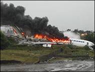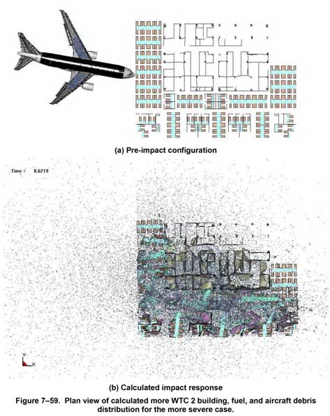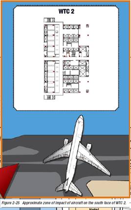 of impact damage on WCT 2 (source: www.geocities.com/debunking911) While no-one can verify the details of such a visualisation, it would be at the very least likely that a significant number of core columns would have been damaged by the impact alone, prior to any weakening by fire. A passenger jet can crash and initiate intense fires, even, apparently, without its aviation fuel igniting, as in this example of an Air France accident:
