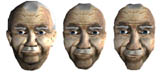 Three virtual photographs of a virtual character's head. In the leftmost image the virtual camera is far away with high zoom, resulting in an almost perspective-free (or orthogonal) view, in which the ears are clearly visible. The middle image shows the ears almost disappearing, due to the camera placed near to the head. The rightmost view is the result of an extreme closeup.